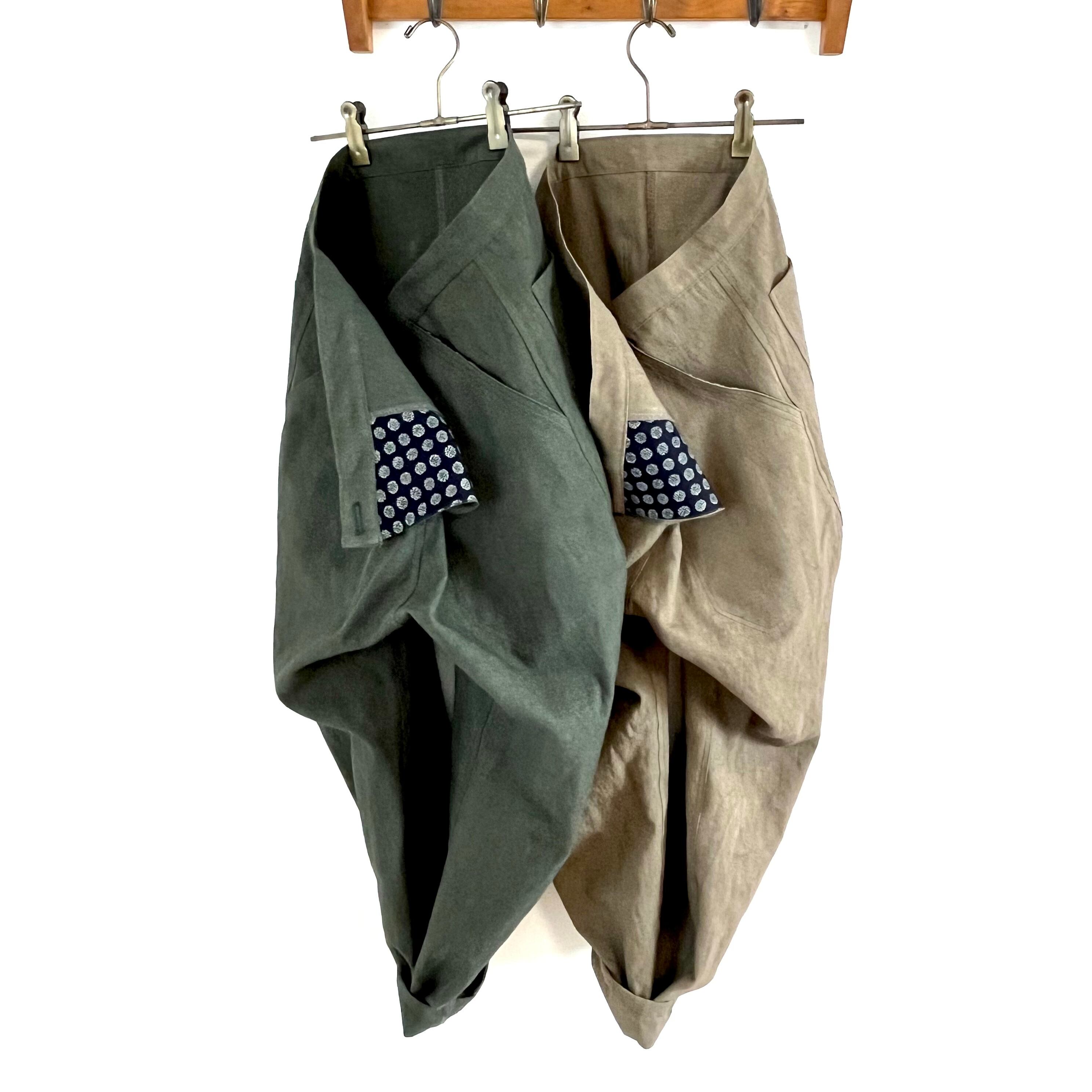 昔のずぼん、モンペやタツケをイメージして作ったボトムで、フロントで生地を重ねて2箇所のボタンで留めて穿く形です。